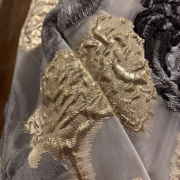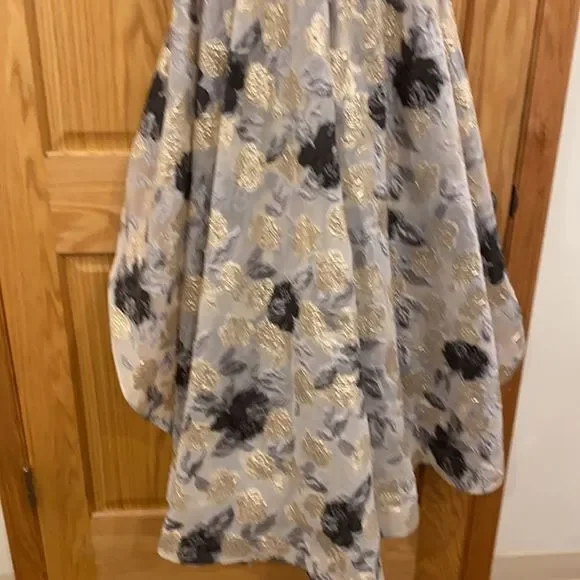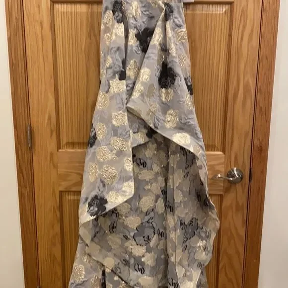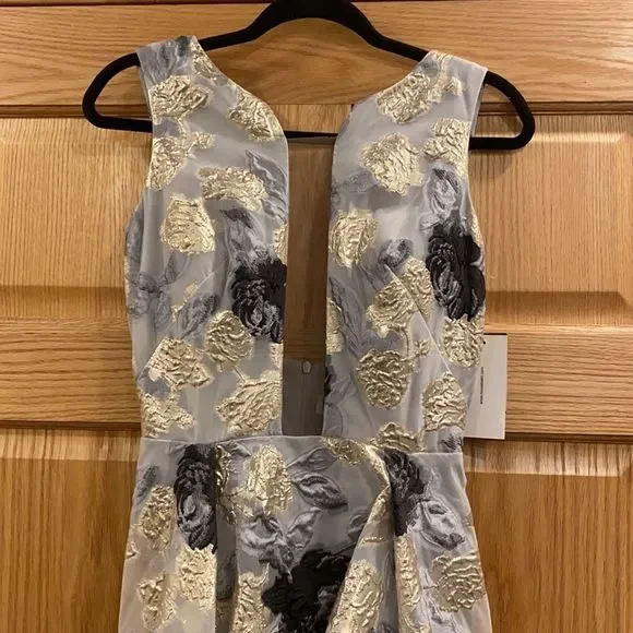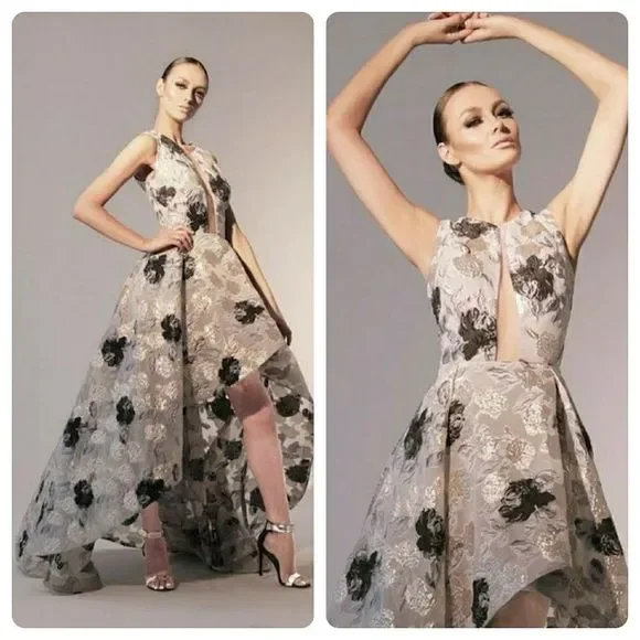The whole dress is designed in floral embroideries as the fitted bodice features a jewel neckline and sheer front panels. Fabulous pleats highlight the a-line skirt and charmingly fall to a high low hemline. Be pretty in this Nicole Bakti creation. Details:Sheer Front Panel, Fitted, Sleeveless, Floral Embroideries, Pleated Skirt Neckline:JewelWaistline:NaturalSilhouette:A-LineLength 63”Arm pit to arm pit 16”Waist 12”